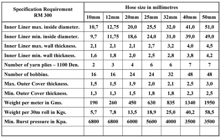 These Specifications are according to S.A.N.S. 1086 Standard Requirements for the above product and they are kept, used and controlled by Reinforced Hosing (Pty) Ltd in their Manufacturing and Quality Control process.